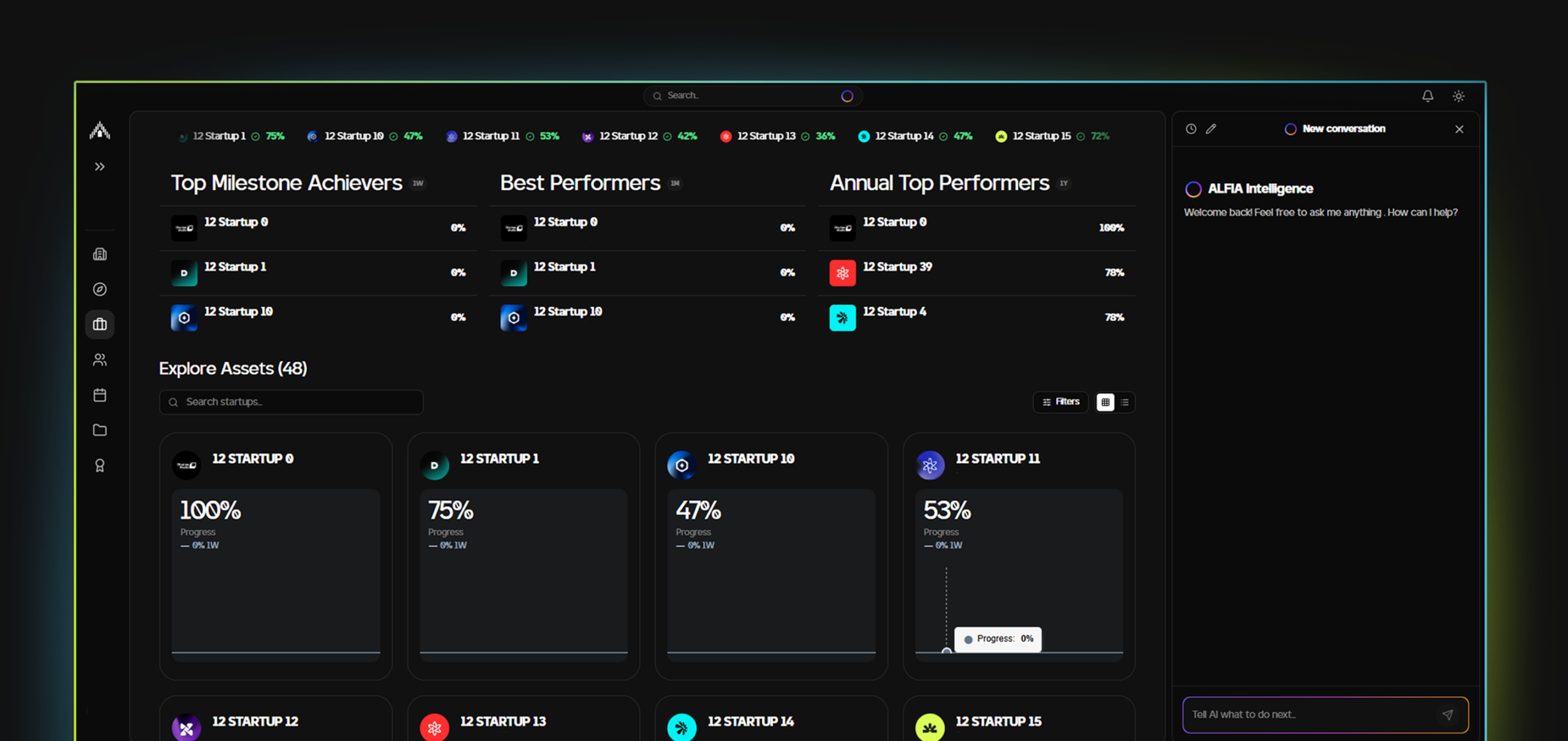 ALFIA Intelligent acts as your AI co-founder — for strategy, pitch preparation, portfolio risk detection, and automated impact reporting.