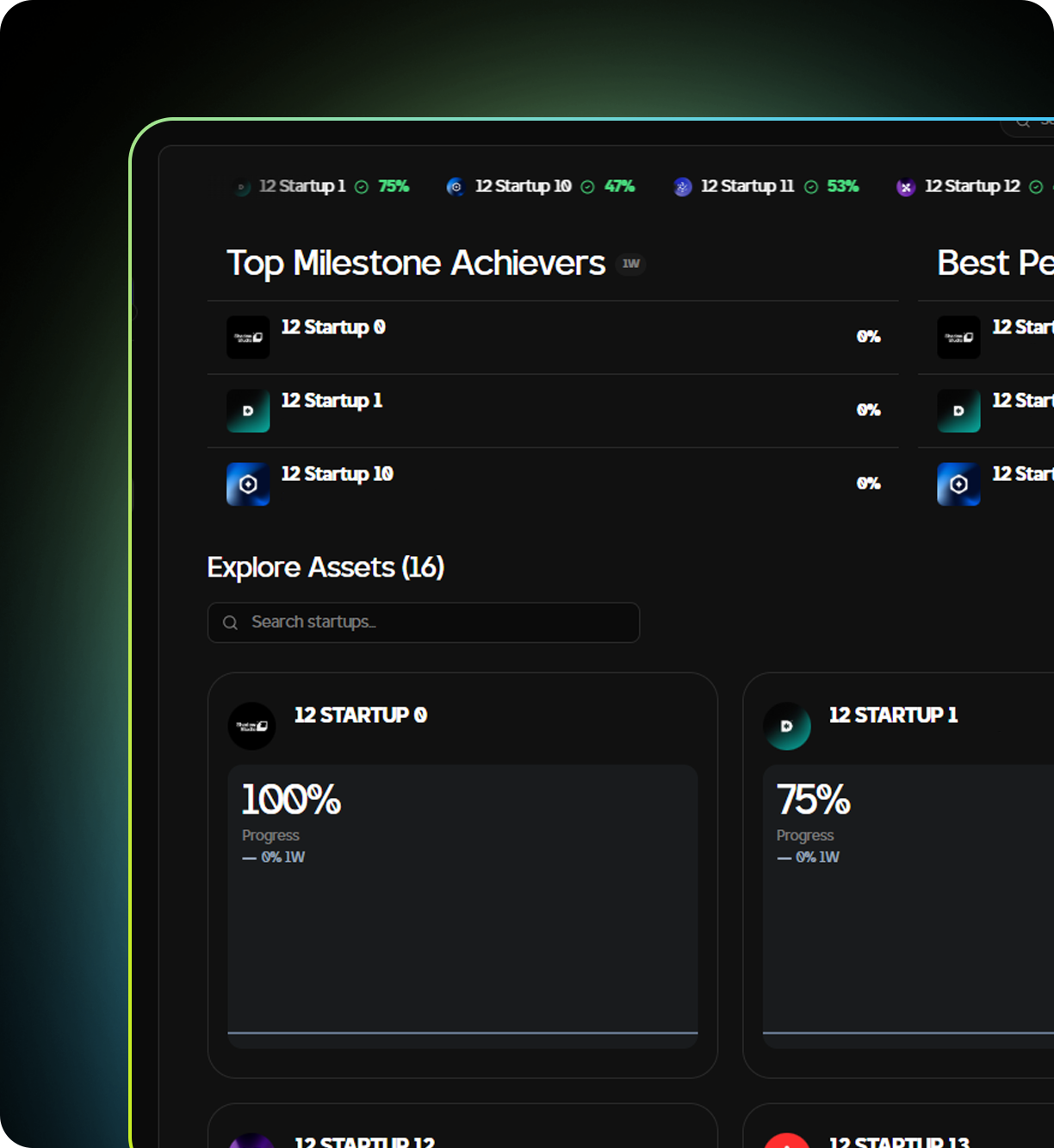 Real-time visibility on every startup's execution velocity, KPI progress, investor readiness score, and equity cleanliness — automatically.